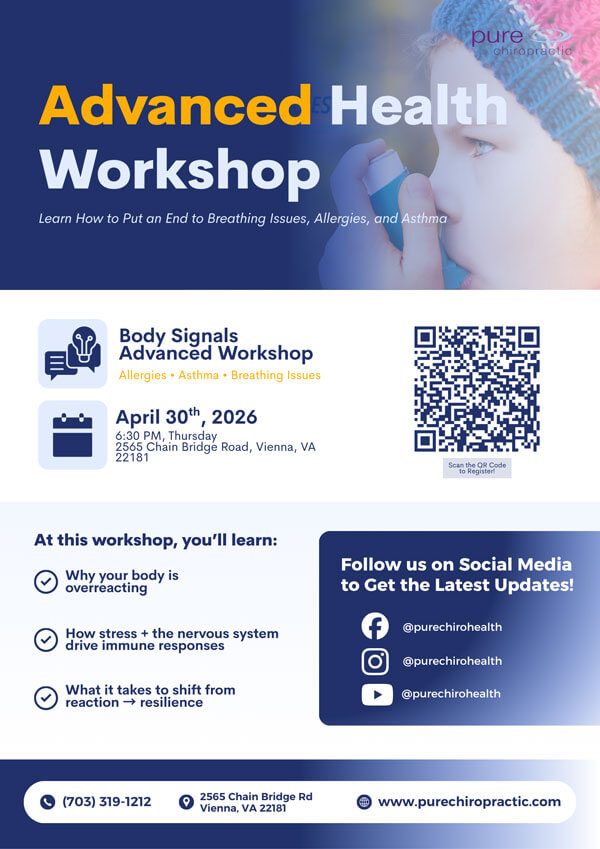 Don’t let allergies, asthma, or breathing issues hold you back. Join us on April 30th and discover how your nervous system holds the key to better respiratory health. Whether you’re looking for answers for yourself or someone you love, this workshop offers a welcoming space to learn more and explore a different way forward. Seating is limited, so reserve your free spot today.